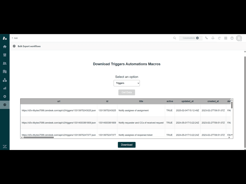 Download Triggers Automations Macros is a powerful Zendesk app designed to help administrators efficiently manage and export essential business rules, including Triggers, Automations, and Macros. This app provides a seamless way to download all configured business rules in a structured format, making it easier to audit, analyze, and share with stakeholders.