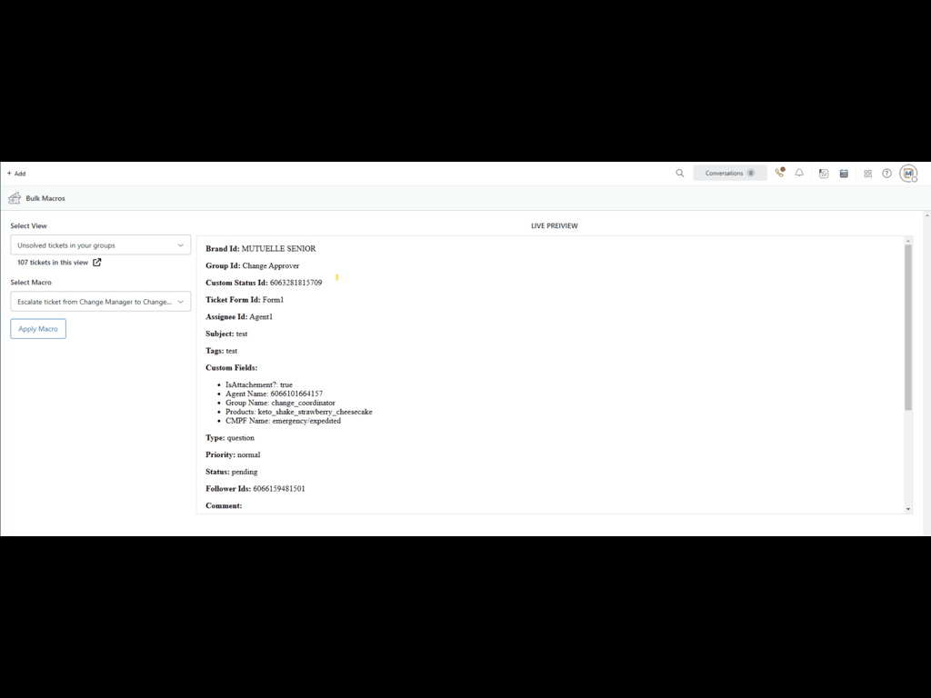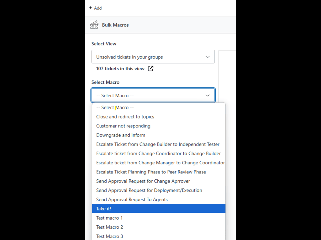 With this feature, users can bypass repetitive actions by applying a macro to every ticket within the view simultaneously. This bulk-action approach accelerates workflows by reducing manual steps and minimizing errors, as a standardized set of actions is applied consistently to each ticket. It is particularly useful for common tasks such as batch-updating ticket statuses, tagging or categorizing tickets, assigning tickets to team members, or adding the same note across multiple tickets based on the macro action.