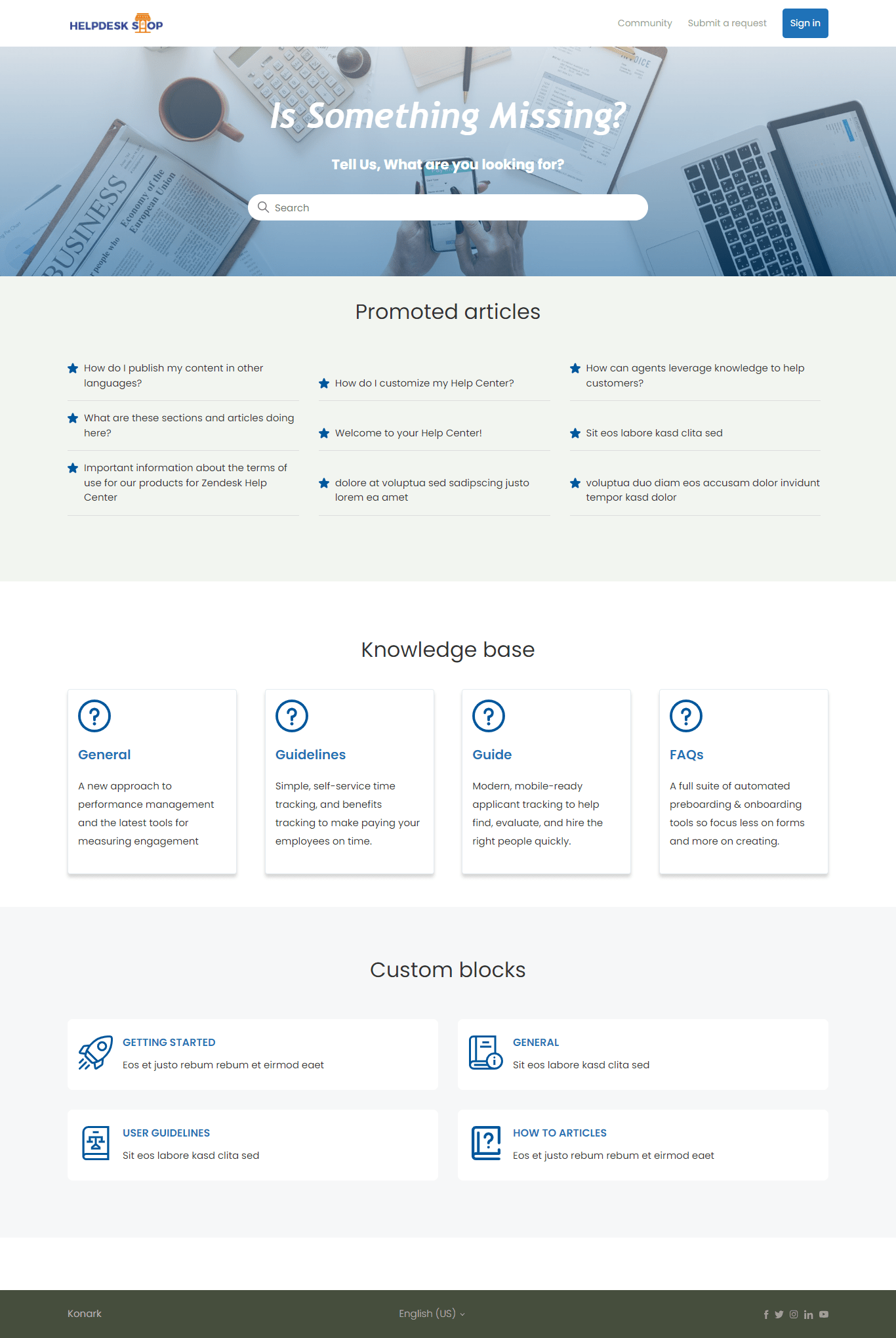 Custom Block Icons – Custom blocks are static links to any pages on your help center or your main website. It’s possible to change the link, icon, title, and description in each of them. You can hide a specific block or all of them in the theme settings and add more through customization.